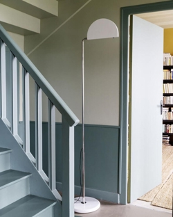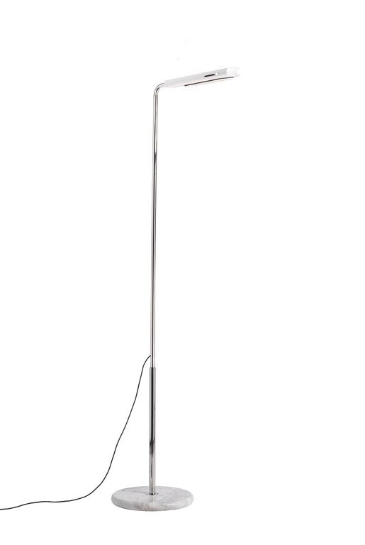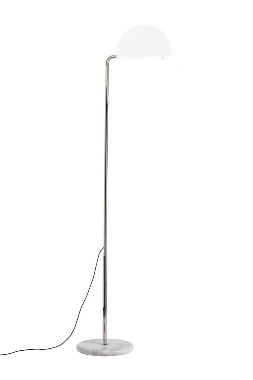 Piękna lampa podłogowa ma podstawę z białego marmuru i stojak z wykończeniem w chromie, który można regulować na wysokość za pomocą systemu teleskopowego. Klosz z kolorowego aluminium można przechylać, aby zmienić kierunek światła.