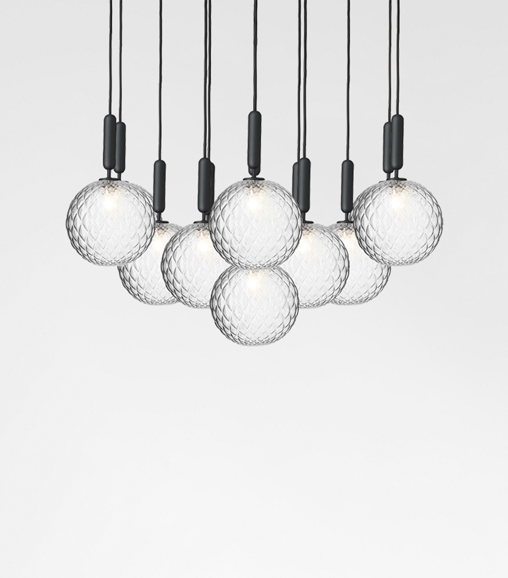 Miira Large to lampa wisząca o większej masie - tworzy doskonałe połączenie z istniejącą lampą Miira, która jest lżejsza w wyrazie. Mimo że nowa Miira Large jest większa niż istniejąca kolekcja Miira, jej minimalistyczny design pozwala zachować elegancki wygląd. Przezroczyste szkło z unikalnym wytłoczonym wzorem tworzy wyjątkową atmosferę w pomieszczeniu. Miira Large uzupełnia kolekcję Miira, dodając różnorodność i dynamikę.