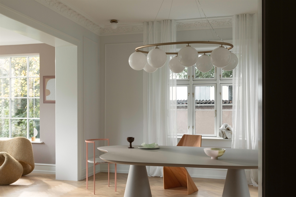 Miira 8 Oval żyrandol z 8 opalowymi kulami szklanymi jest szczególnie odpowiedni jako duża lampa nad stół jadalny.