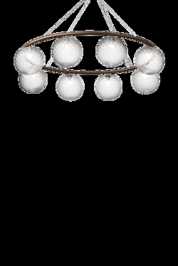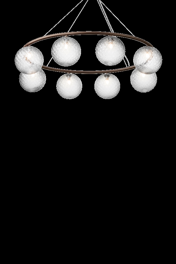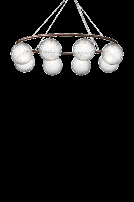 Żyrandol Miira składa się z metalowego pierścienia z anodowanego aluminium w ciemnym brązie. Stąd piękne dmuchane szklane kule rozpraszają zmysłowe światło. Prosta i klasyczna forma sprawia, że żyrandol jest niezwykle użyteczny w wielu aranżacjach.