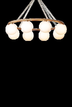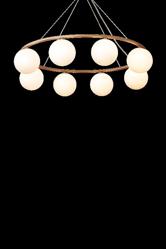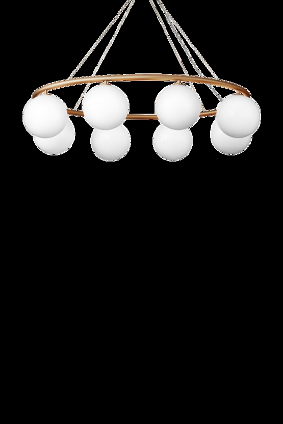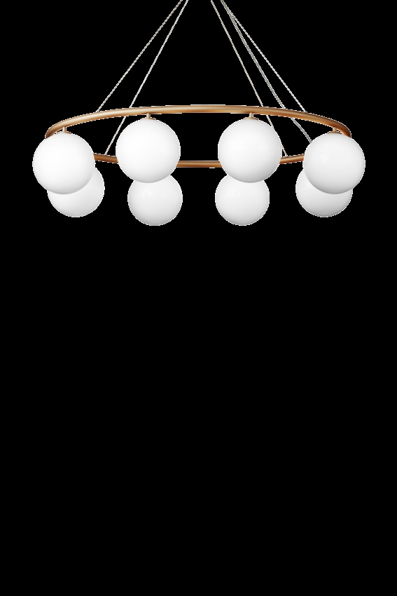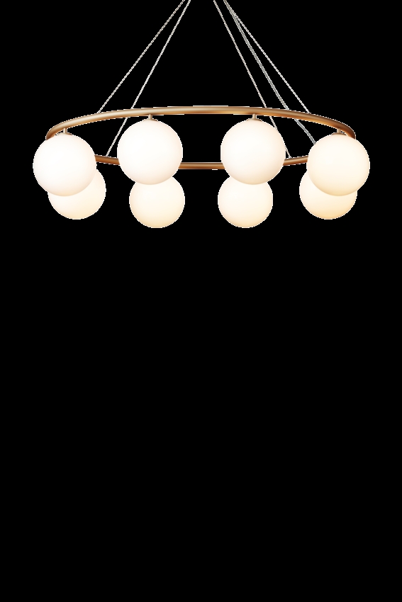 Żyrandol Miira składa się z metalowego pierścienia z anodowanego aluminium w pięknym mosiężnym kolorze. Stąd piękne dmuchane szklane kule z opalowego szkła rozpraszają zmysłowe światło. Prosta i klasyczna forma sprawia, że żyrandol jest niezwykle użyteczny w wielu aranżacjach.