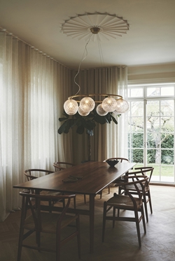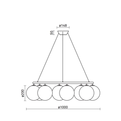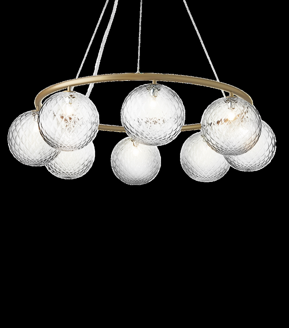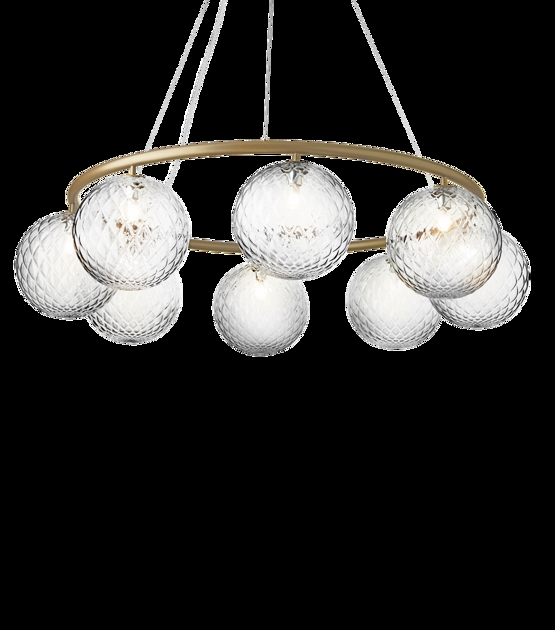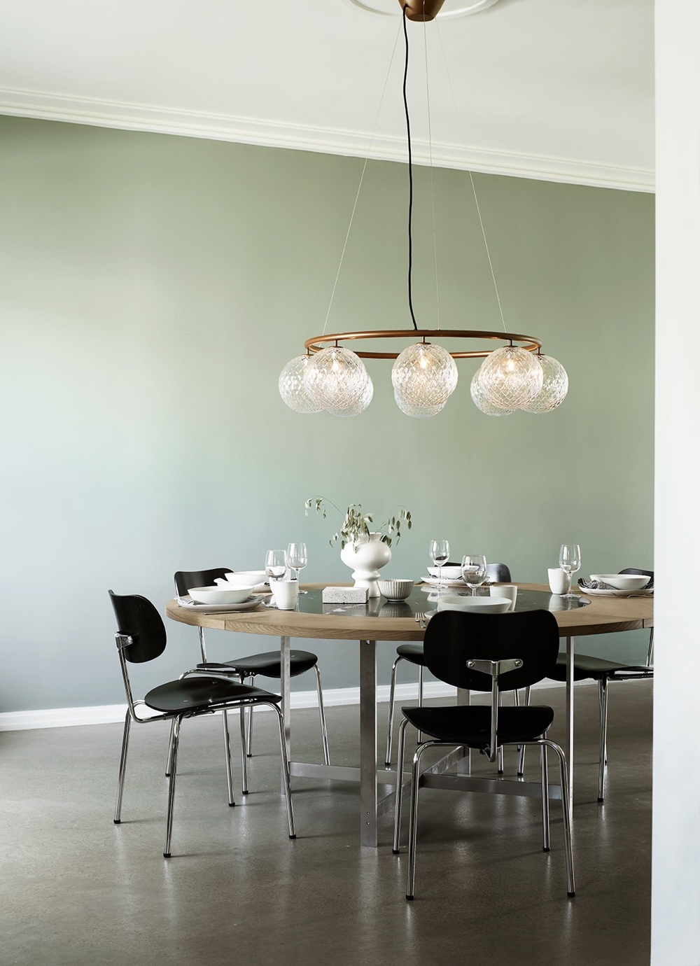 Miira 8 Circular z ośmioma szklanymi kulami ma średnicę 100 cm. Większy żyrandol jest szczególnie odpowiedni nad dużym stołem jadalnym lub jako efektowne oświetlenie w dużym holu lub korytarzu.