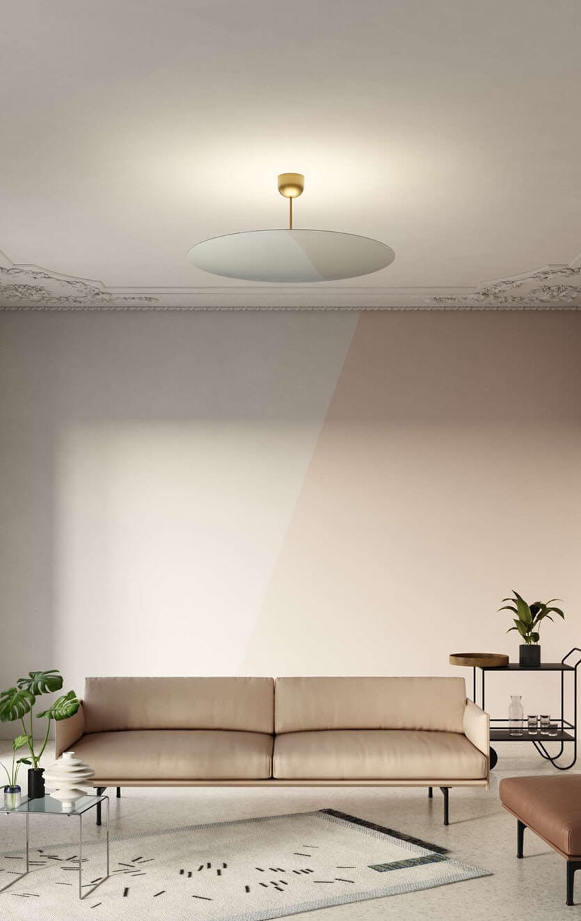 Millimetro z jego stałym trzonem między sufitem a kloszem jest połączeniem klasycznej lampy sufitowej i zwisu. Cienki klosz z efektem lustra ukrywa źródło światła, które emituje jednolite miękkie światło.