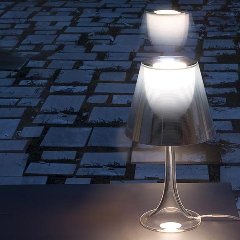 Nowoczesna i piękna lampa stołowa z poliwęglanu. Klosz jest pokryty aluminium od wewnątrz, co minimalizuje przenikanie światła przez zewnętrzny klosz. Wyjątkiem jest Miss K, T soft, która z plisowanym materiałowym kloszem daje bardziej rozproszone światło.