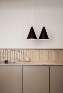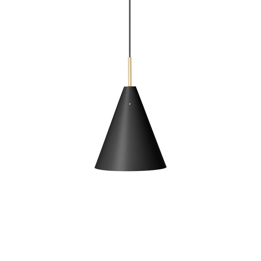 Powierzchnia klosza wykonana jest z matowo malowanej stali, która pięknie łączy się z mosiężnymi detalami, dodającymi lampie ciepła. Stożkowy kształt klosza kieruje światło w dół.