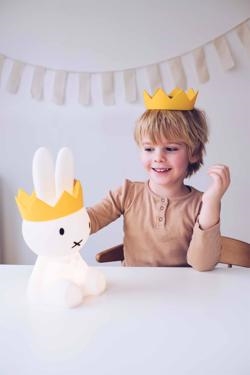 Uwaga! Korona nie jest lampą samą w sobie, lecz akcesorium zaprojektowanym do lampki Miffy. Elegancka korona pięknie prezentuje się na obu uszach królika, niezależnie od tego, czy to mniejsza lampka Miffy First Light (30 cm), czy oryginalna lampka Miffy (50 cm). Korona może być również używana na lampce Miffy XL (80 cm), gdzie umieszcza się ją wokół jednego ucha. Przy zakupie korony dołączona jest również opaska, dzięki której dzieci mogą łatwo nosić koronę.