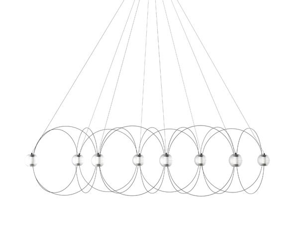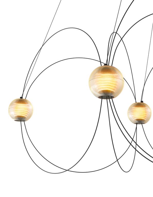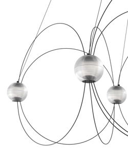Żyrandol Munari z 8 kulistymi kloszami to rzeźbiarski i graficzny dodatek do wnętrza z lekkim i eleganckim designem. Struktura z równowagą między czarnymi prętami a świecącymi kulami z zintegrowanymi źródłami światła LED przywodzi na myśl konstelację kosmicznych planet, świecących atomów lub linii pola magnetycznego.