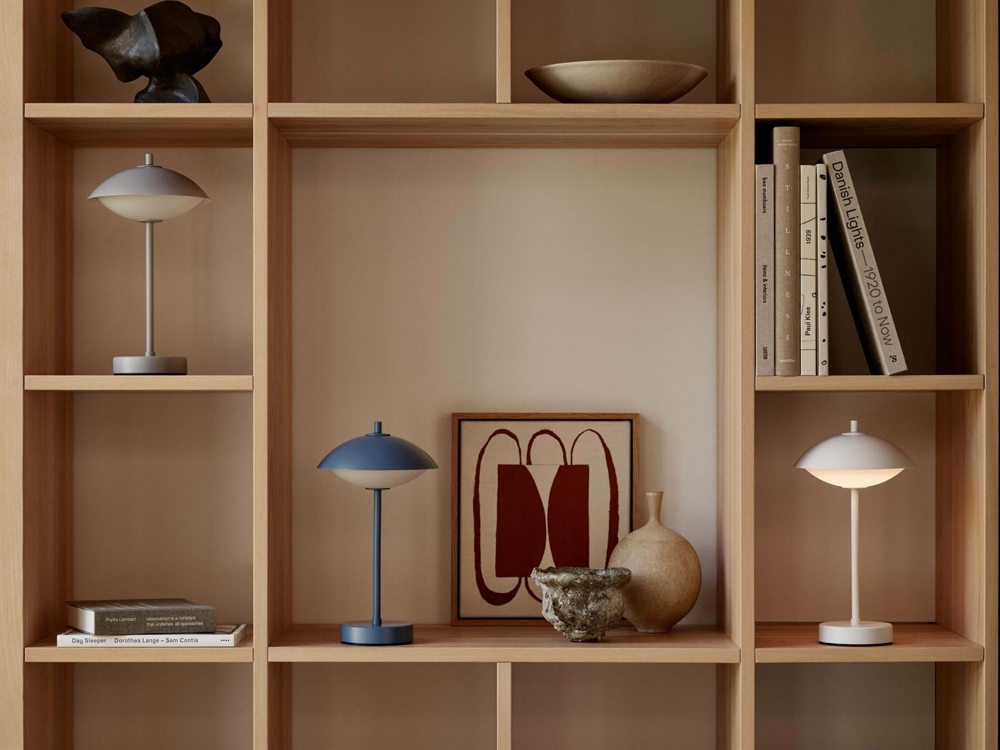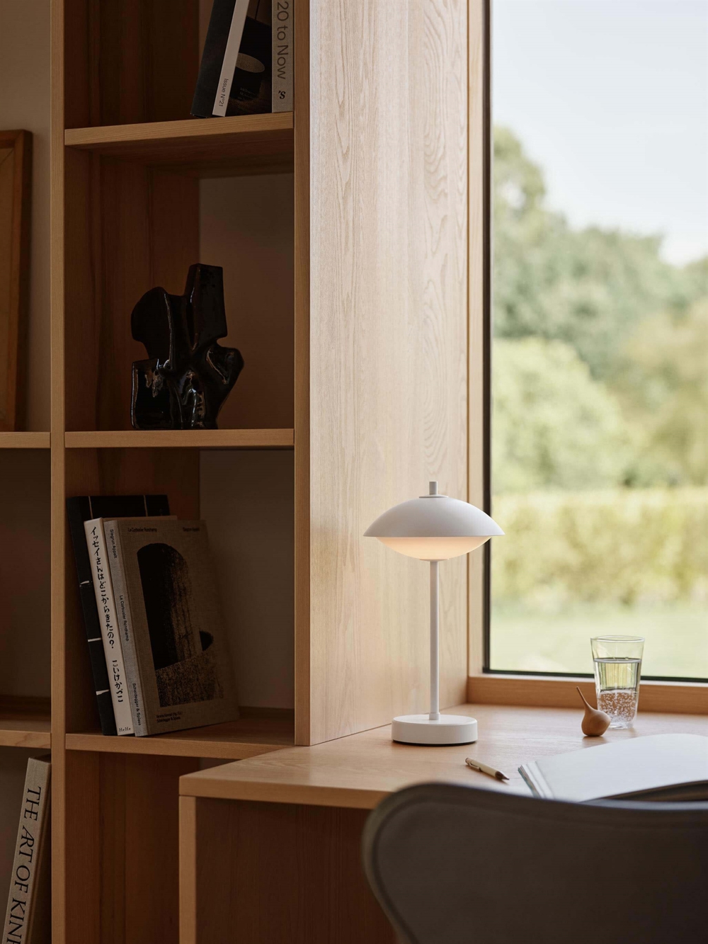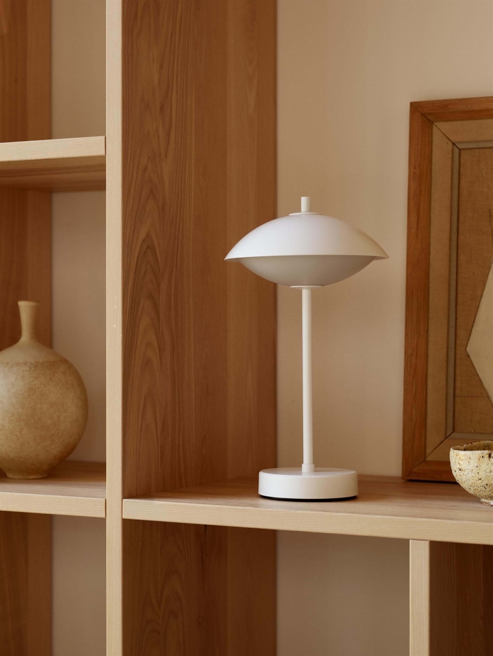 Przenośna lampa bateryjna Musling Portable w matowej bieli jest inspirowana muszlami z natury i może być używana zarówno wewnątrz, na przykład w salonie, jak i na zewnątrz na tarasie. Projekt jest elegancki i pasuje zarówno do nowoczesnych, jak i klasycznych wnętrz. Musling Portable jest łatwa do przenoszenia i idealna na półkę, biurko lub dowolny inny stół. Może być również używana w kąciku do czytania lub jako oświetlenie zewnętrzne, gdzie funkcja ściemniania pozwala stworzyć odpowiedni nastrój.