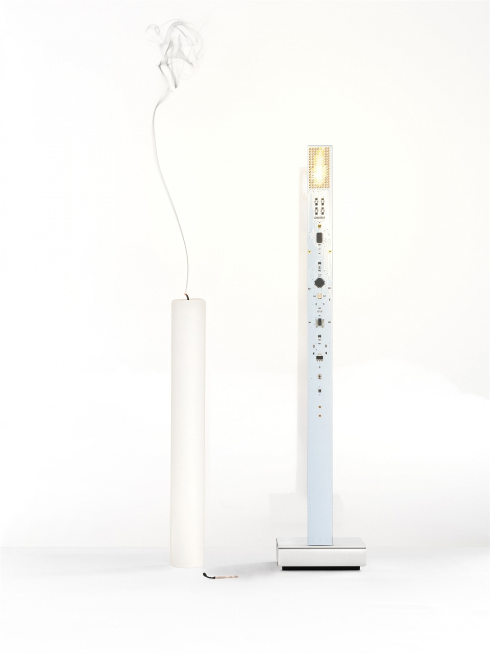 Ingo Maurer My New Flame lampa stołowa wykonana jest z płytek drukowanych, metalu i plastiku. Na podstawie materiału wideo, diody LED odtwarzają migoczący płomień świecy w realistyczny i przyciągający sposób. W podstawie znajduje się włącznik/wyłącznik oraz czarny kabel USB (150 cm)