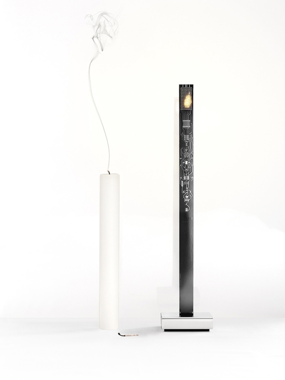 Ingo Maurer My New Flame lampa stołowa jest wykonana z płytek drukowanych, metalu i plastiku. Na podstawie materiału wideo, diody LED odtwarzają migoczący płomień świecy w realistyczny i przyciągający sposób. W podstawie znajduje się włącznik/wyłącznik oraz czarny kabel USB (150 cm)