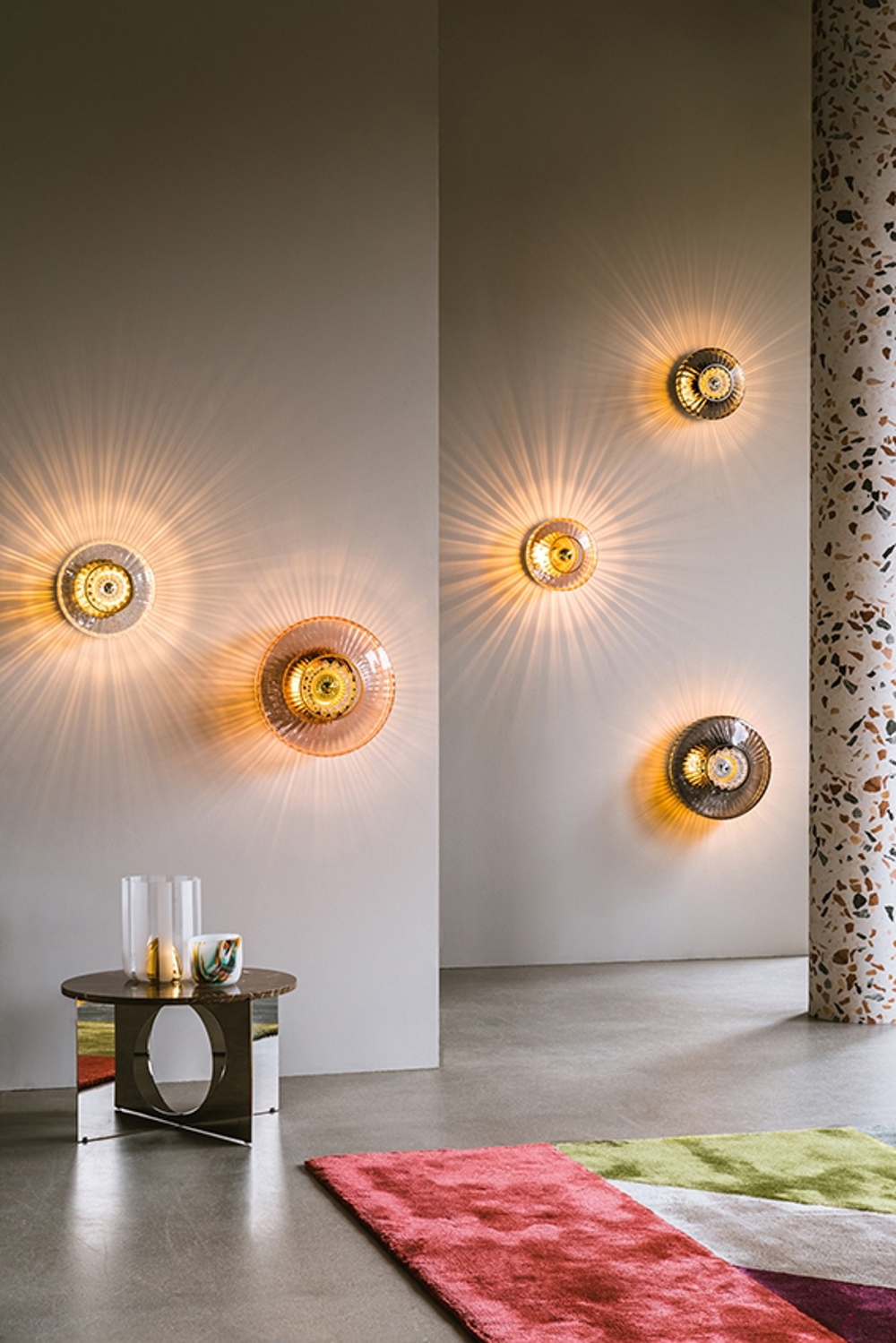 New Wave Optic lampa wyraźnie pokazuje, jak projekty Design By Us mogą tworzyć przestrzeń same w sobie, ponieważ światło z niej daje wyjątkowe wrażenie. Doskonale pasuje do każdego pomieszczenia. New Wave Optic kinkiet dostępny jest zarówno w oryginalnym rozmiarze, jak i w wersji XL z amber, różowym, przezroczystym lub dymionym szkłem.