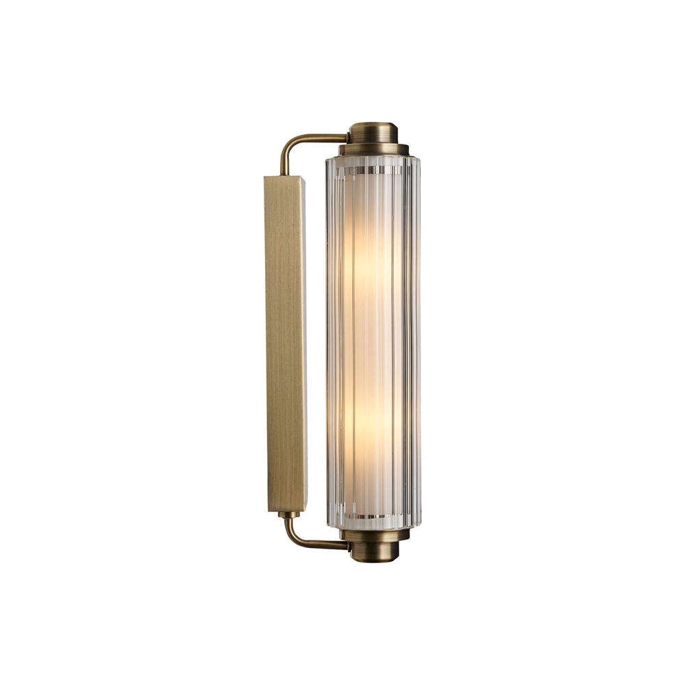 Kinkiet Nimal Double z wykończeniem w mosiądzu, dzięki klasie IP44, nadaje się do łazienek i innych wnętrz. Użyj eleganckiej lampy nad lub obok lustra, gdzie design w stylu Art Deco z pięknym żebrowanym kloszem będzie zarówno dekoracyjny, jak i zapewni przyjemne światło.