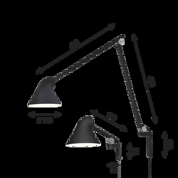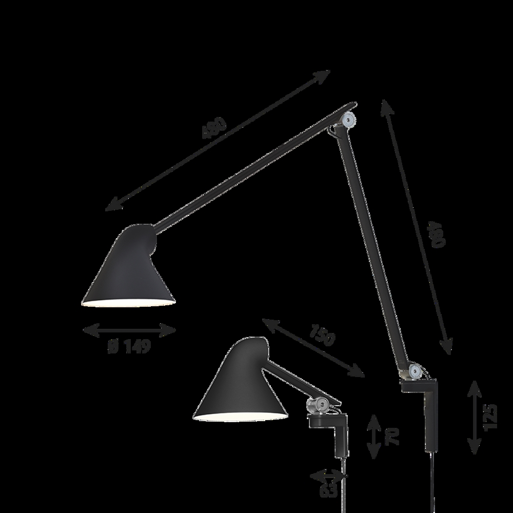Seria lamp NJP obejmuje lampy podłogowe, kinkiety z krótkim lub długim ramieniem oraz lampy stołowe w wielu wariantach w kolorze czarnym, białym i jasnym alu szarym.