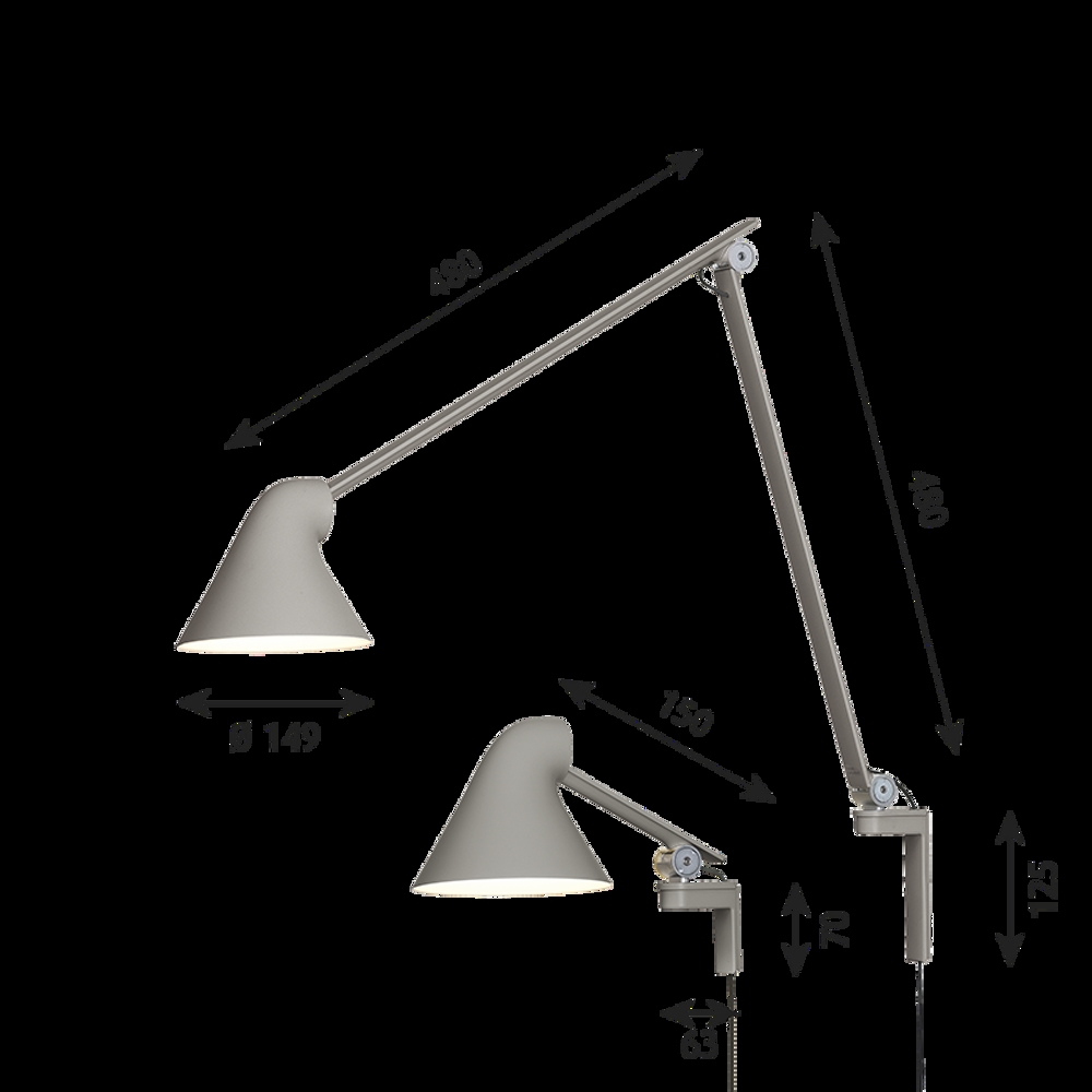 Seria lamp NJP obejmuje lampy podłogowe, kinkiety z krótkim lub długim ramieniem oraz lampy stołowe w wielu wariantach w kolorze czarnym, białym i jasnym alu szarym.