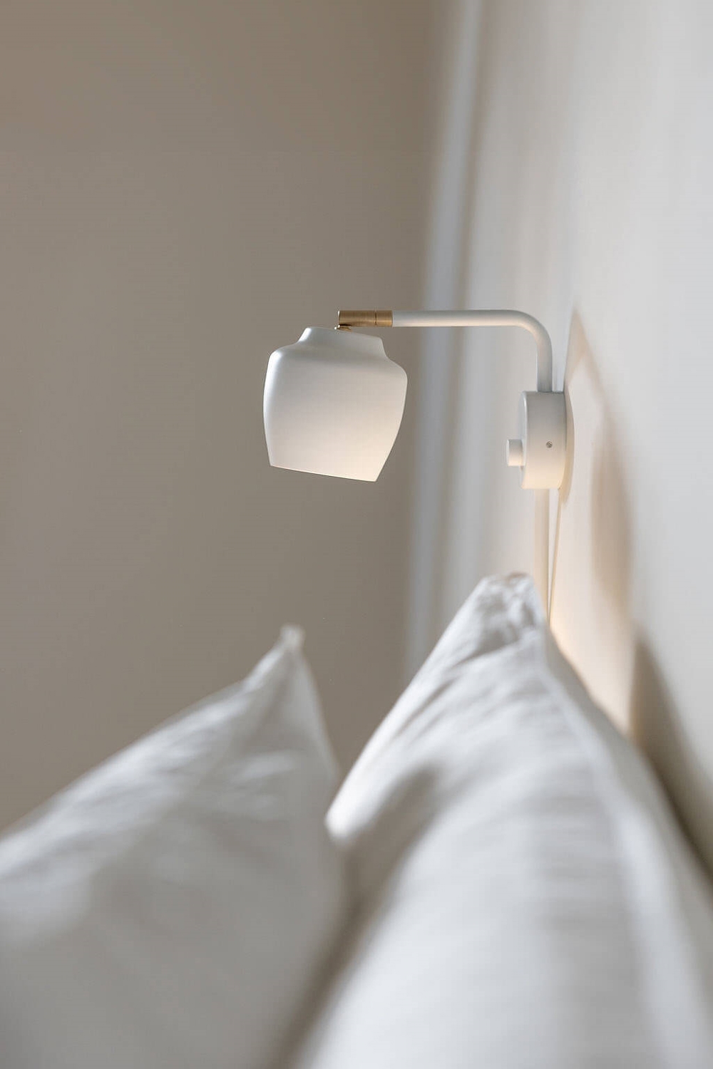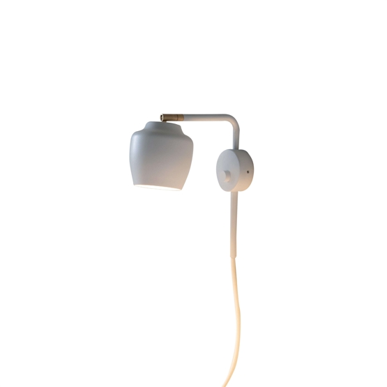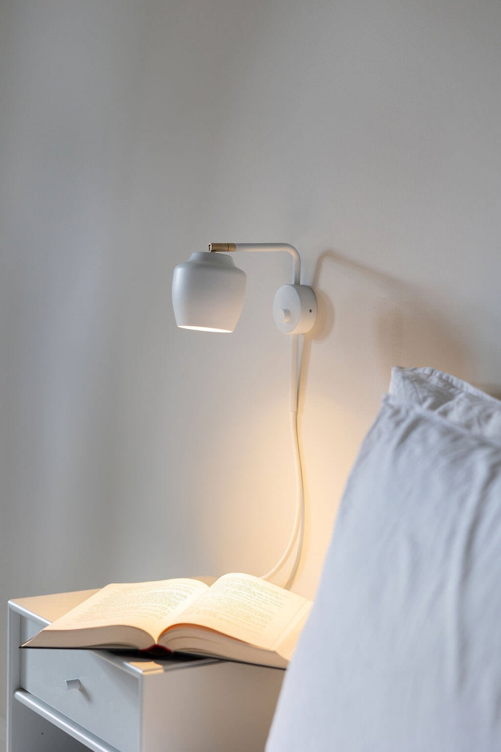 Kinkiet Nola ma minimalistyczny i ponadczasowy design i jest idealny jako lampka do czytania przy łóżku w sypialni lub przy sofie w salonie. Klosz i podstawa wykonane są z aluminium, natomiast ramię lampy jest ze stali, a przegub z surowego mosiądzu, który z czasem nabiera patyny. Światło można skierować, a kinkiet włącza się i wyłącza za pomocą przełącznika na podstawie.