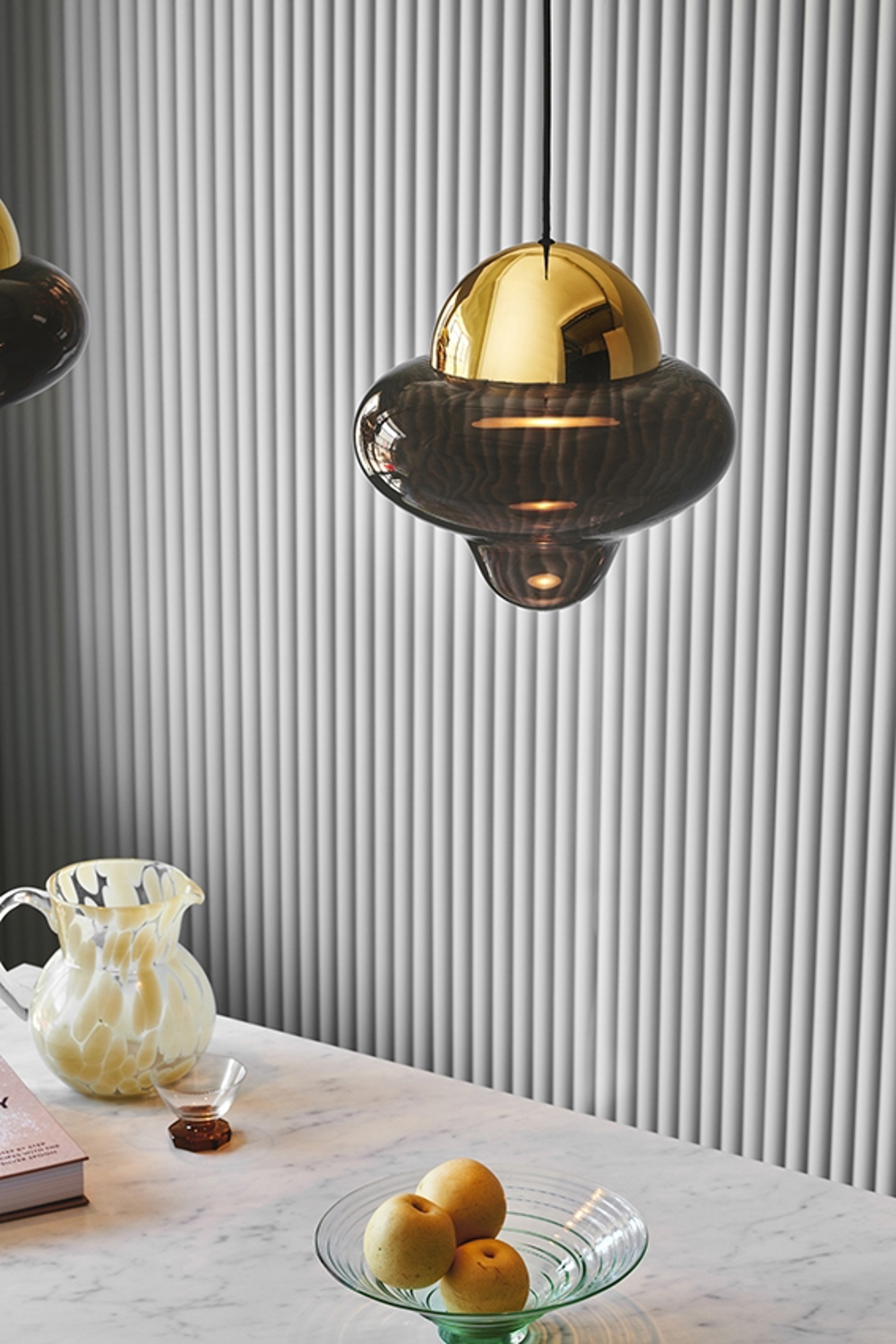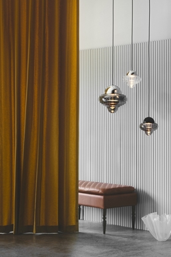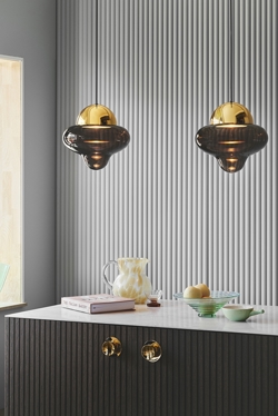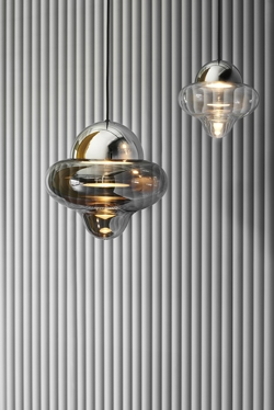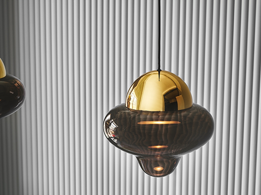 Lampa Nutty dostępna jest z przezroczystym, brązowym i dymionym szkłem z czarną, złotą lub chromowaną górą, dzięki czemu pasuje do każdego wnętrza.