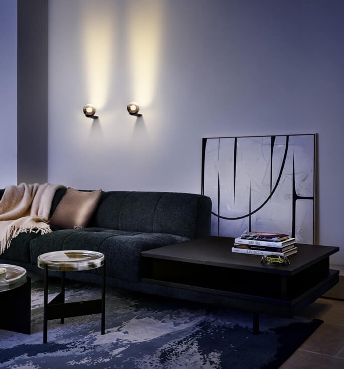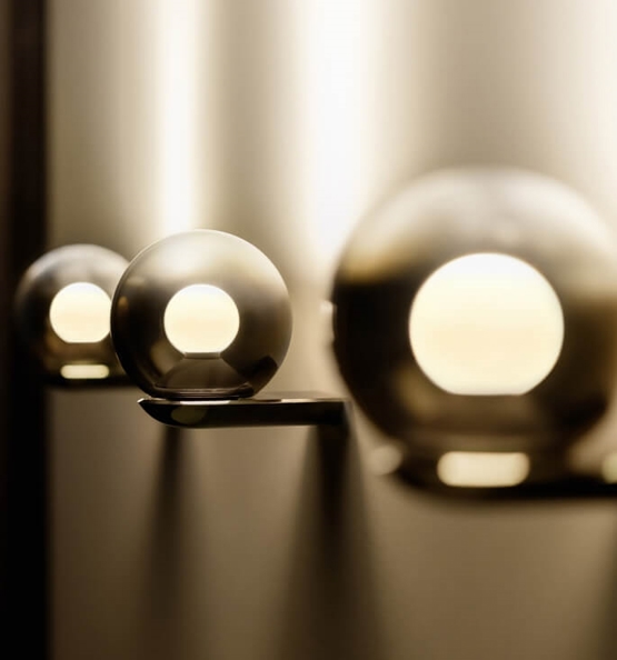 Occhio Luna Parete przekształca Twoją ścianę w dzieło sztuki świetlnej. Lustrzana szklana kula odbija światło Occhio Fireball na ścianę i sufit, tworząc harmonijne, miękkie i nastrojowe oświetlenie, które wypełnia pomieszczenie spokojem i magią. Metaliczna powłoka PVD lampy nadaje elegancki połysk, podczas gdy źródło światła unosi się niczym wschodzący księżyc, subtelnie i dynamicznie podkreślając otoczenie.
