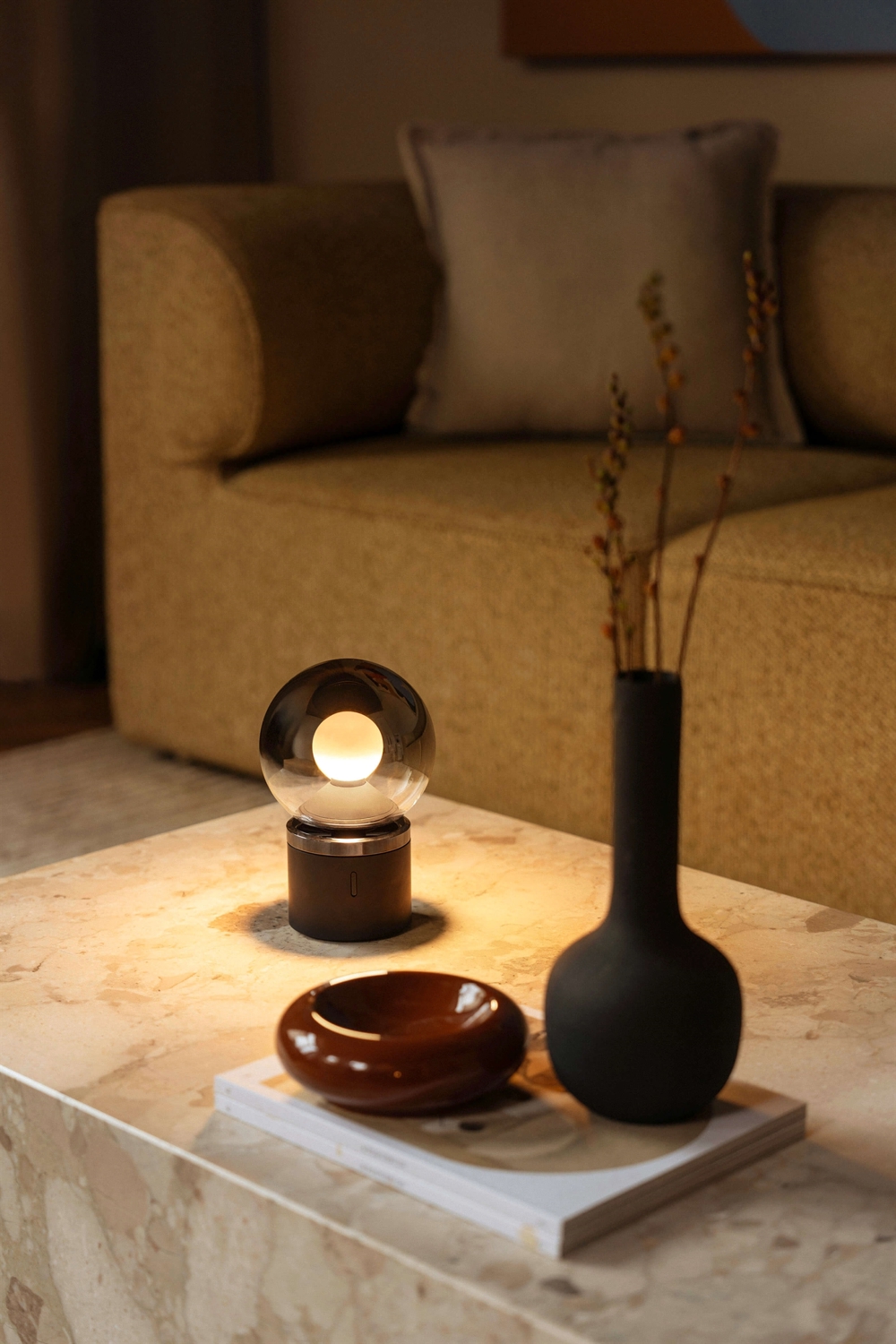 Luna Pura jest przenośna i łatwa do zabrania ze sobą. Emituje miękkie i nieoślepiające światło z Occhio fireball-optics w środku kulistego klosza lampy. Podstawa jest matowa czarna i kończy się przed kloszem szczytem w dark chrome.