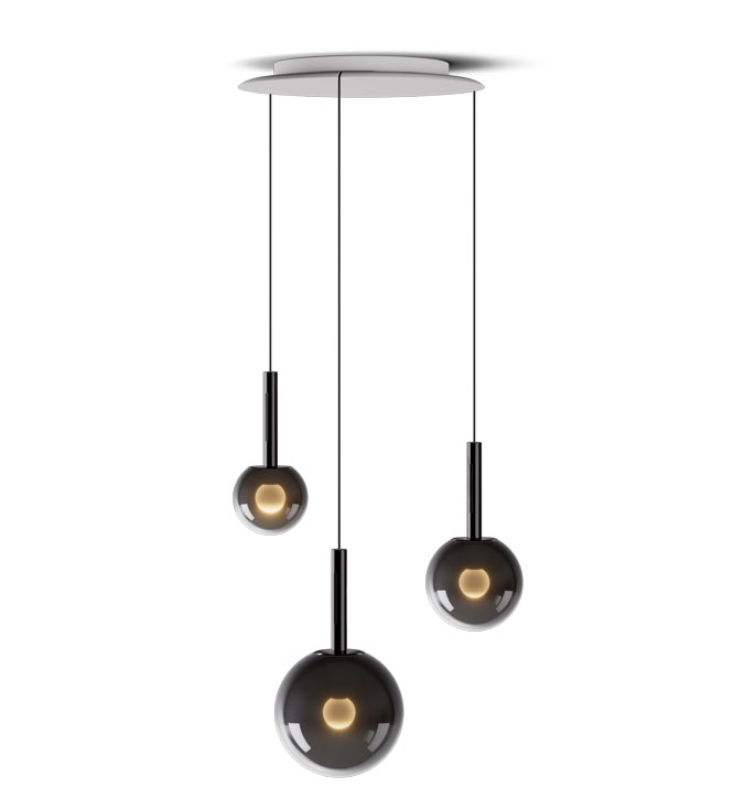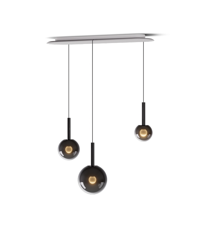 Occhio Luna Sospeso Cloud 3 to żyrandol z trzema szklanymi kulami, gdzie każda kula swobodnie unosi się i odbija światło w pięknych, dynamicznych wzorach. Projekt opiera się na księżycowej estetyce serii Luna Sospeso i łączy minimalistyczną elegancję z funkcjonalnym oświetleniem.