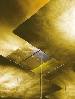 Wspaniała lampa wisząca Oh Mei Ma Kabir składa się z sześciu arkuszy papierowego złota oraz ciężarka wykonanego z pleksiglasu.