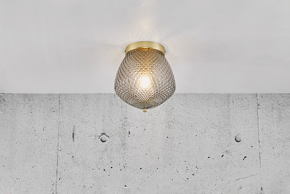 Orbiform lampa sufitowa składa się z połączenia mosiądzu i dymionego szkła. Szkło ma wzór diamentu, który odbija światło na różne sposoby w pomieszczeniu.