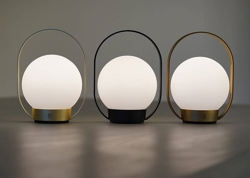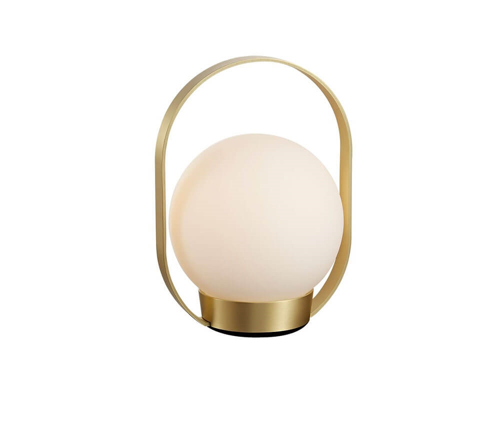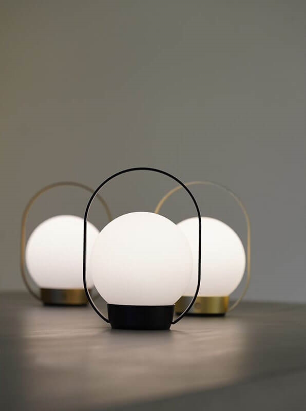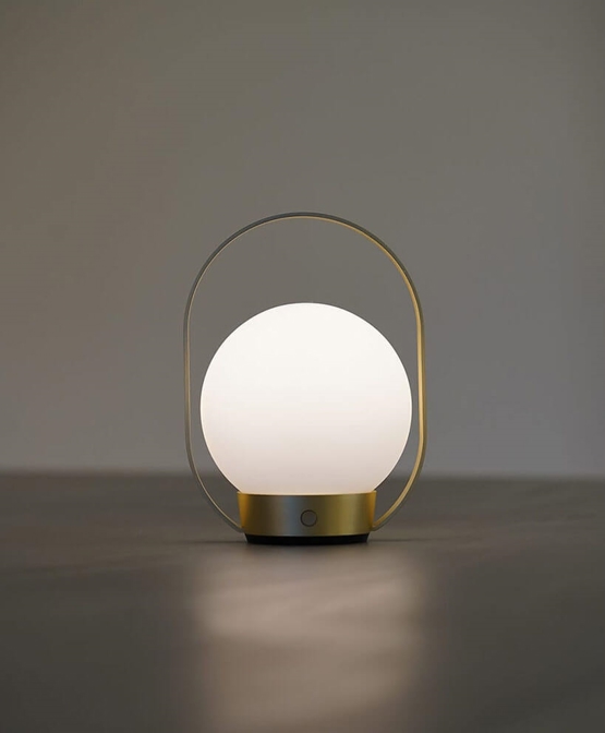 Projekt łączy klasyczny wygląd z nowoczesną funkcjonalnością i zapewnia przyjemne światło. Okrągły klosz z opalowego szkła spoczywa w metalowej ramie, a przenośna konstrukcja z praktycznym uchwytem sprawia, że przenośna lampa jest łatwa do zabrania ze sobą.