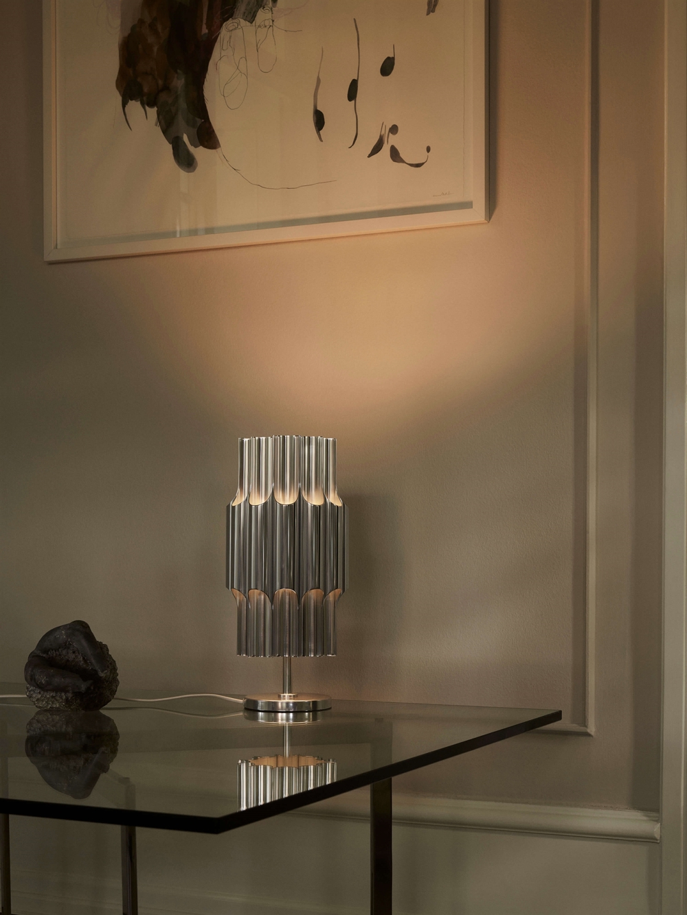 Elegancka lampa stołowa składa się z 12 aluminiowych rur, które są pięknie oświetlone przez otwarte rury. Rury świetlne kierują światło zarówno w górę, jak i w dół. Światło skierowane w górę zapewnia dyskretne oświetlenie otoczenia, podczas gdy światło skierowane w dół zapewnia przyjemne oświetlenie przy stole.
