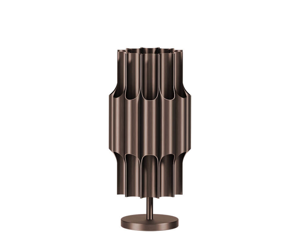 Lampa stołowa Pan 190 to piękny i dekoracyjny projekt autorstwa Bent Karlby, inspirowany fletnią Pana. Projekt składa się z błyszczących rur świetlnych z anodowanego aluminium z wykończeniem w kolorze brązu, które doskonale pasuje do wielu nowoczesnych wnętrz.
