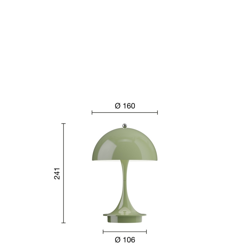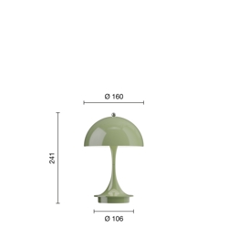 Ta Panthella ma podstawę i nieprzezroczysty klosz w kolorze zielonym. To model V3 Panthella 160 Portable, a ta wersja kolorystyczna została wprowadzona w 2025 roku. W porównaniu do wcześniejszych modeli, model V3 został między innymi ulepszony o dłuższy czas pracy na baterii i ma wbudowaną kontrolę światła w pokrętle na górze klosza, gdzie wcześniej funkcja ściemniania i włączania/wyłączania była na podstawie.