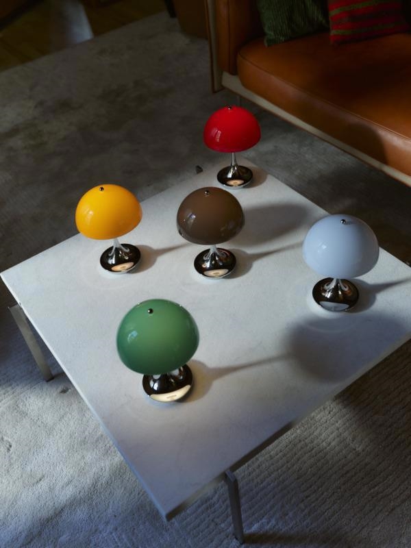Panthella 160 Portable V3 jest dostępna w kilku różnych wykończeniach. Warianty z oryginalnymi kolorami Panthella z lat 70. mają opalowe klosze w zielonym, pomarańczowym, czerwonym, brązowym lub niebieskoszarym.