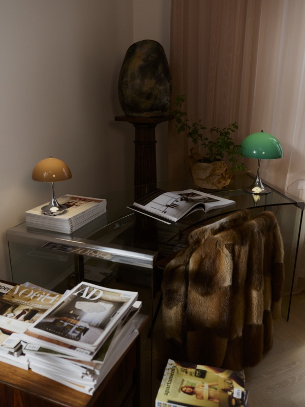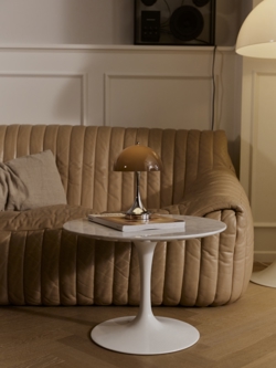Ikoniczna lampa Panthella została zaprojektowana w 1971 roku. Lampa jest klasycznym przykładem, jak Panton miał wyczucie do przyjemnego oświetlenia i ponadczasowego, wyrazistego designu, który pasuje do każdego wnętrza. Ta ładowalna wersja z opalowym kloszem w oryginalnym brązowym kolorze Panthella z lat 70. została wprowadzona w 2026 roku z okazji 100. urodzin Vernera Pantona.