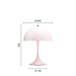 Ta Panthella ma podstawę i opalowy klosz w jasnoróżowym kolorze. To model V3 Panthella 250 Portable, który zostanie wprowadzony na rynek w 2025 roku. W porównaniu do wcześniejszych modeli, model V3 został ulepszony o dłuższy czas pracy baterii i funkcję chroniącą baterię, jeśli używasz lampy podczas podłączenia do gniazdka. Ponadto nowy model ma włącznik/wyłącznik wbudowany w gałkę na górze klosza, gdzie wcześniej znajdował się na podstawie.