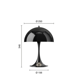 Ta Panthella ma podstawę i nieprzezroczysty klosz w kolorze czarnym. To model V3 Panthella 250 Portable, który zostanie wprowadzony na rynek w 2025 roku. W porównaniu do wcześniejszych modeli, model V3 został między innymi ulepszony o dłuższy czas pracy baterii i funkcję, która chroni baterię, jeśli używa się lampy podczas podłączenia do gniazdka. Ponadto nowy model ma wbudowaną funkcję włączania/wyłączania w gałce na górze klosza, gdzie wcześniej była na podstawie.
