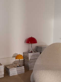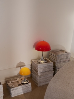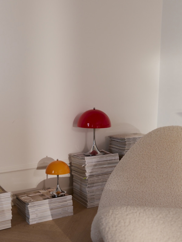 Ta Panthella ma podstawę w chromie i klosz w czerwonym opalu. To model V3 Panthella 250 Portable, który został wprowadzony na rynek w 2025 roku. W porównaniu do wcześniejszych modeli, model V3 został między innymi ulepszony o dłuższy czas pracy baterii i funkcję, która chroni baterię, jeśli używasz lampy, gdy jest podłączona do gniazdka. Ponadto nowy model ma funkcję włączania/wyłączania wbudowaną w gałkę na górze klosza, gdzie wcześniej była na podstawie.