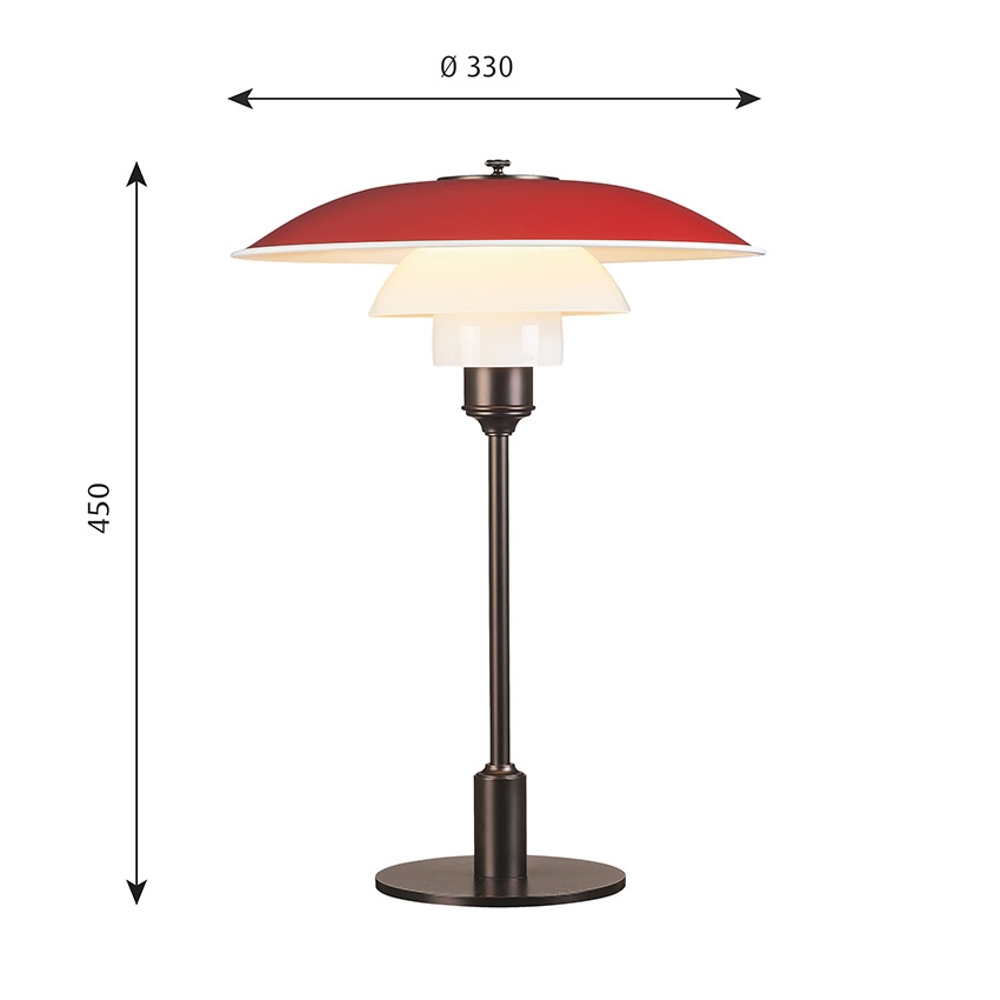 Lampa stołowa PH 3½-2½ jest dostępna z górnym kloszem w kolorze czerwonym, z wyciąganego aluminium, gdzie uchwyt klosza i stojak są z jedwabistego matowego mosiądzu.