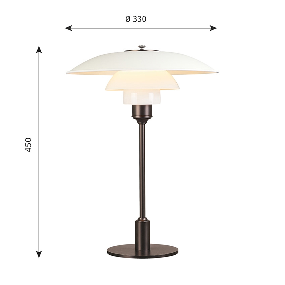 Numer lampy PH odnosi się do rozmiaru kloszy. Dlatego lampa stołowa PH 3½-2½ składa się z górnego klosza o średnicy około 35 cm i dolnych kloszy z wersji 2½.