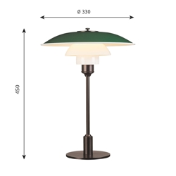 Lampa stołowa PH 3½-2½ jest dostępna z górnym kloszem w zielonym, lakierowanym proszkowo wyciąganym aluminium, gdzie uchwyt klosza i stojak są z jedwabistego matowego brązowego mosiądzu.