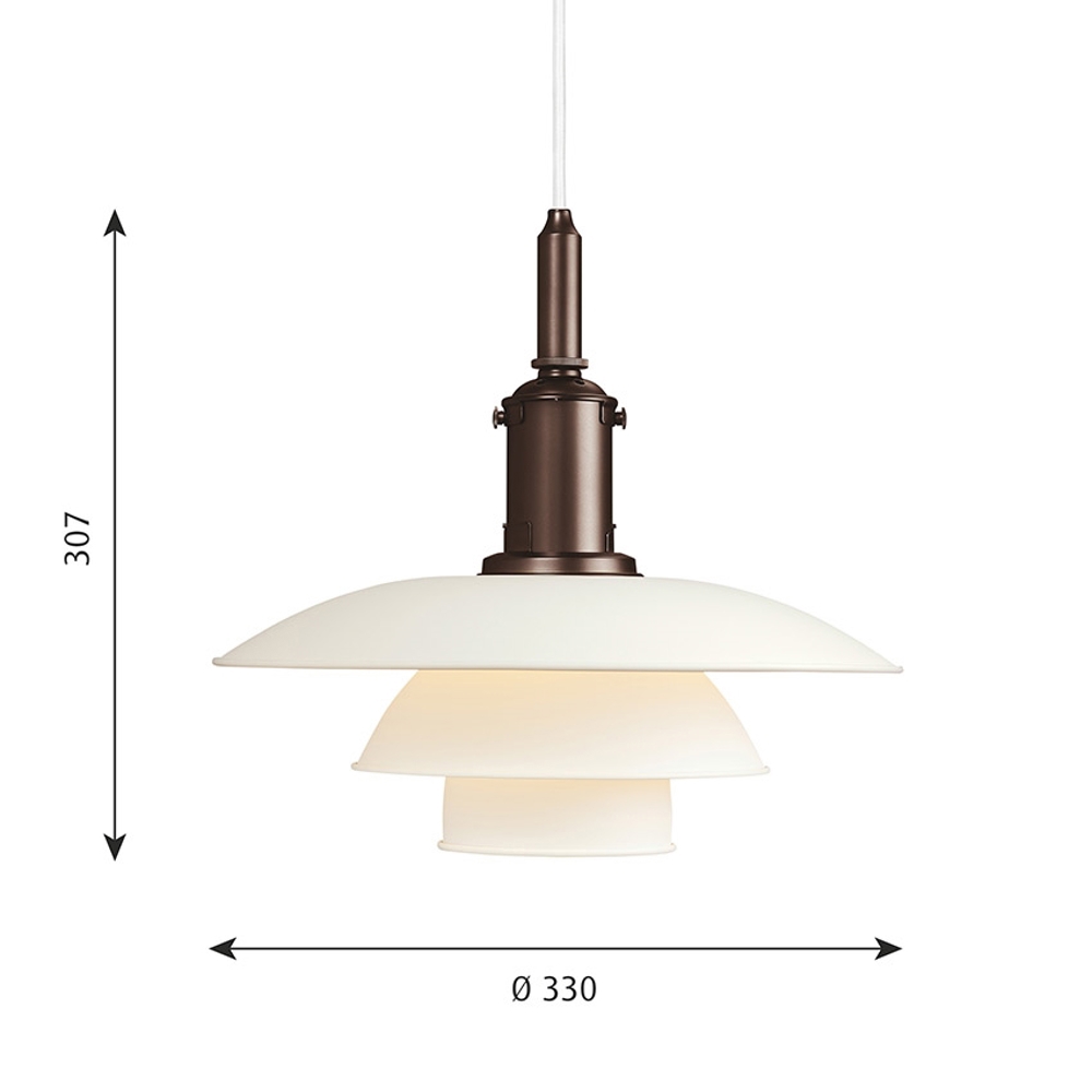 Numer lampy PH odnosi się do rozmiaru kloszy. Dlatego lampa wisząca PH 3½-3 składa się z górnego klosza o średnicy około 35 cm i dolnych kloszy z wersji 3/3.
