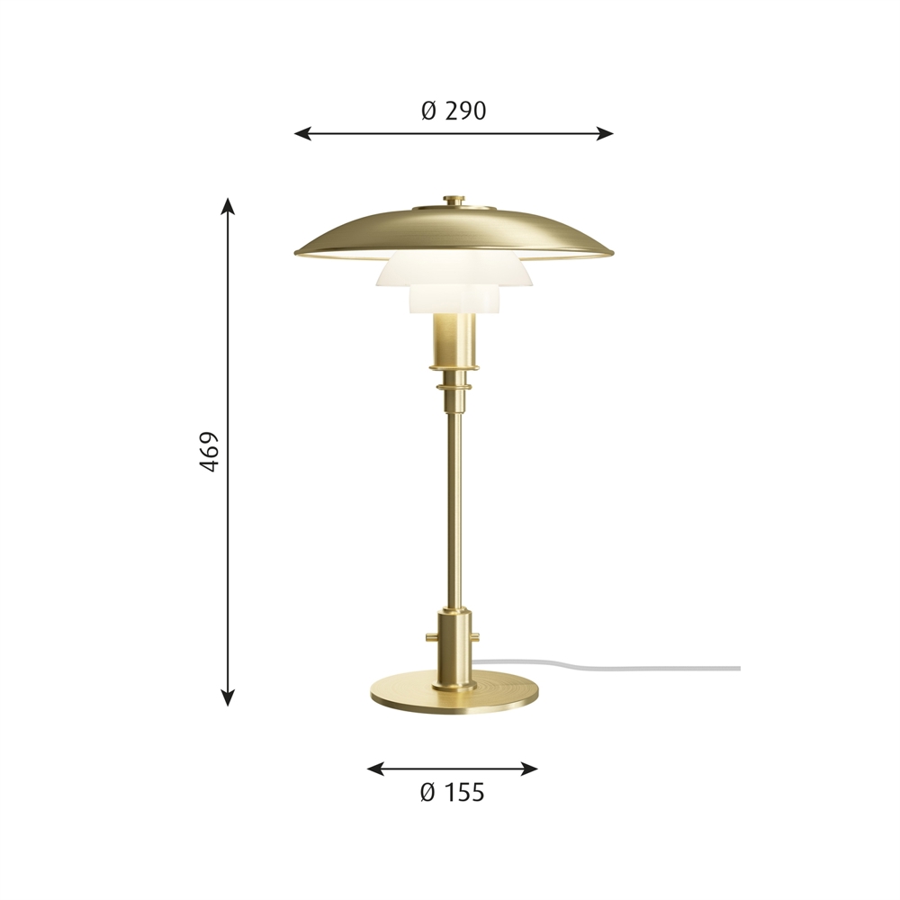 Numer PH odnosi się do rozmiaru kloszy. Dlatego lampa stołowa PH 3/2 składa się z górnego klosza o średnicy ok. 30 cm oraz dolnych kloszy pochodzących z wersji 2/2.