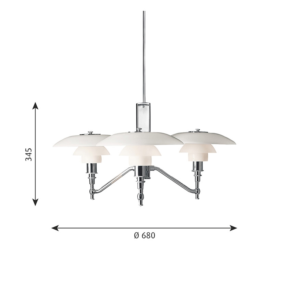 Wyjątkowy żyrandol PH 3/2 Akademi zapewnia miękkie i harmonijne światło z trzech lamp z kloszami z ręcznie dmuchanego białego szkła opalowego w trzech warstwach, które przede wszystkim kierują światło w dół.
