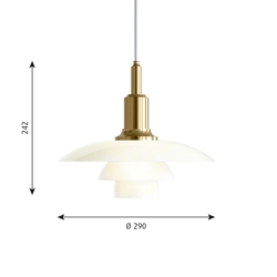 Numer PH odnosi się do rozmiaru kloszy. Dlatego PH 3/2 lampa wisząca składa się z górnego klosza o średnicy ok. 30 cm oraz dolnych kloszy z wersji 2/2.