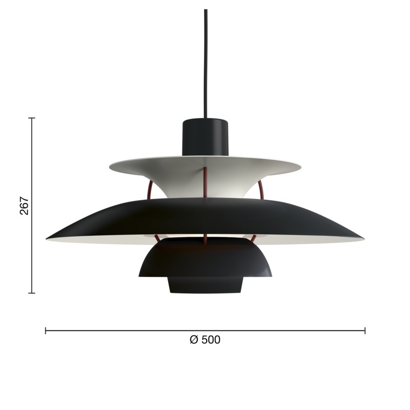 Numer lampy PH odnosi się do rozmiaru kloszy. Dlatego PH 5 pendel składa się z górnego klosza o średnicy około Ø50 cm.