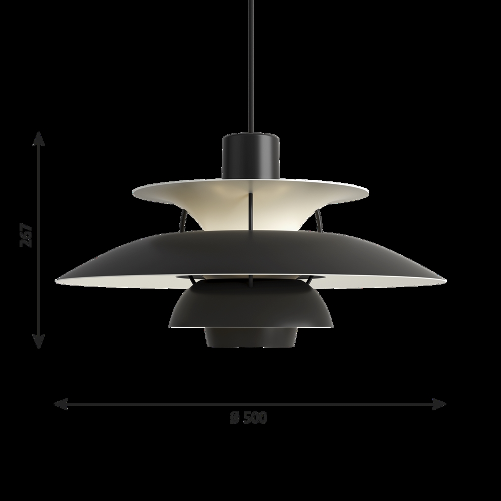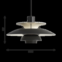 Numer PH odnosi się do rozmiaru kloszy. Dlatego PH 5 lampa wisząca składa się z górnego klosza o średnicy ok. Ø50 cm.