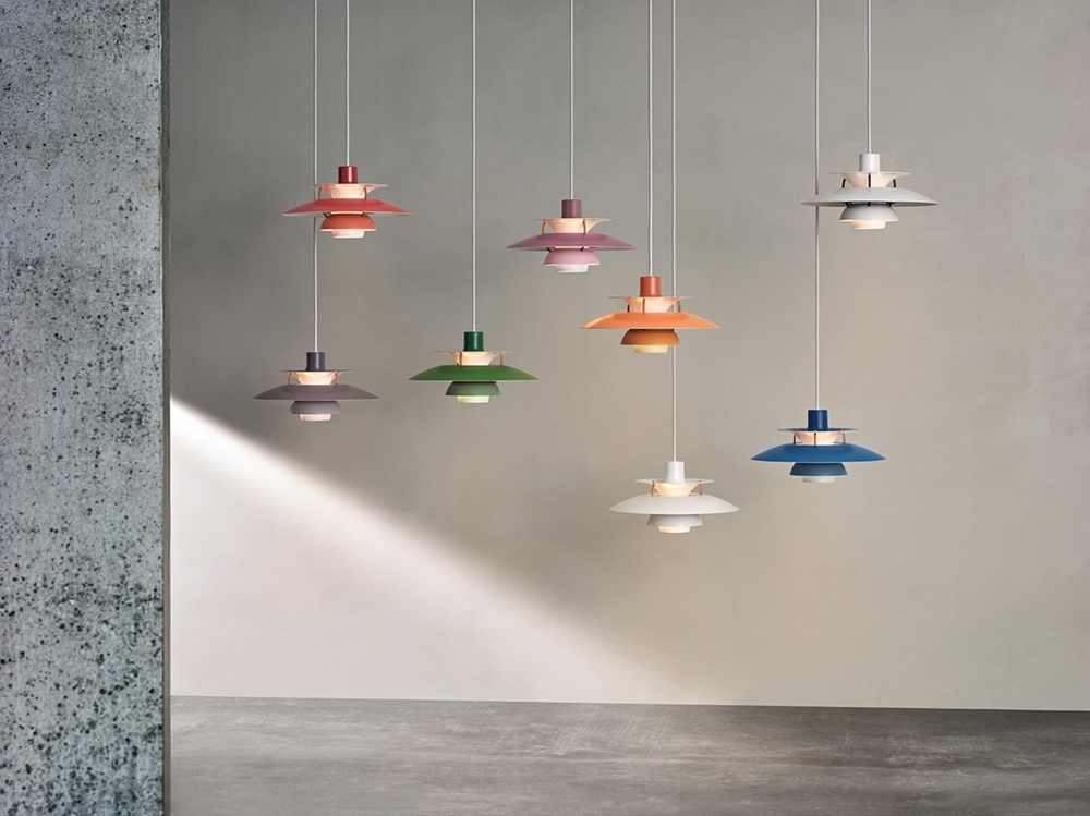 Lampa PH 5 dostępna jest z kloszami i osłonami w proszkowo lakierowanym aluminium, miedzi lub mosiądzu.