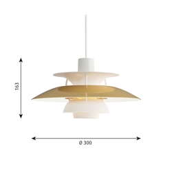 Unikalna lampa wisząca jest niezwykle wszechstronna i pasuje zarówno do klasycznych, jak i nowoczesnych wnętrz. Ta mniejsza wersja oryginalnej PH 5 jest zgodna z pierwotnym, unikalnym projektem. Górny klosz PH 5 Mini ma średnicę około 30 cm.