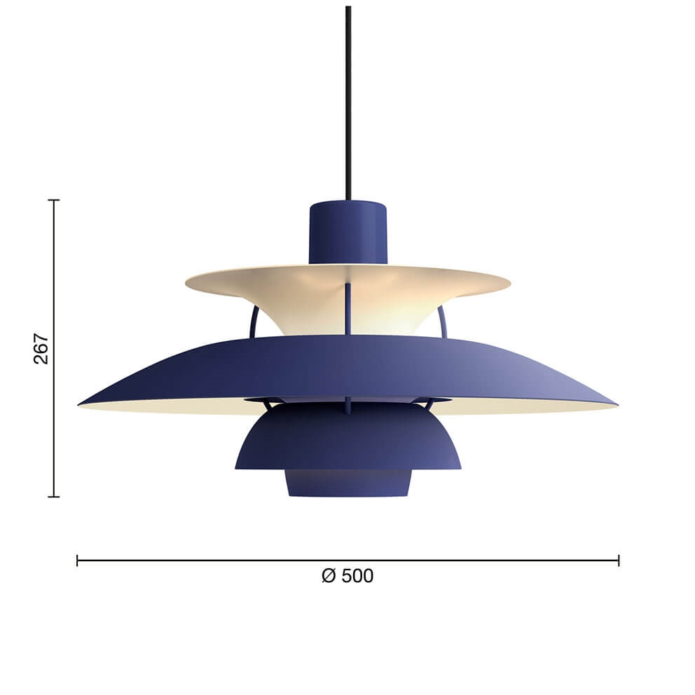 Numer lampy PH odnosi się do rozmiaru kloszy. Dlatego PH 5 pendel składa się z górnego klosza o średnicy ok. Ø50 cm.