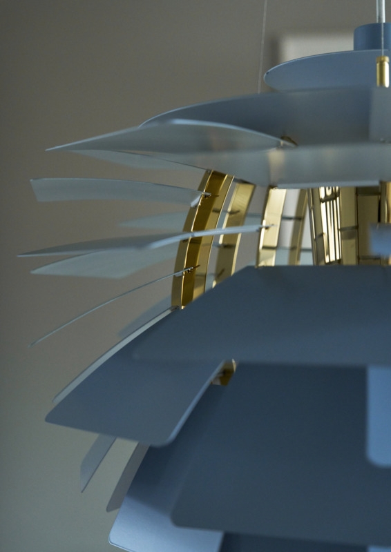 Unikalny pendel odbija światło zarówno do wewnątrz, jak i na zewnątrz, co przyczynia się do emisji wspaniałego światła. Płytki w PH Artichoke w kolorze dusty blue/messing wykonane są z laserowo ciętej stali i mają blady, szarawo-niebieski kolor z chłodnymi tonami, które wprowadzają spokój do otoczenia. Górna osłona jest wykonana z tłoczonej stali, rama jest ze stali z wykończeniem z metalizowanego mosiądzu, a zawieszenie z tłoczonego aluminium.