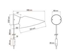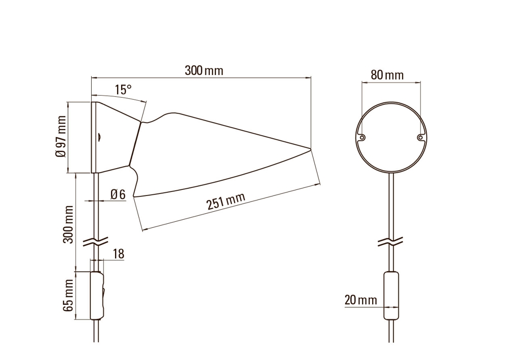 Plume kinkiet ma czarną podstawę z aluminium i jest dostępny w różnych modelach – z kloszem z polikarbonatu lub porcelany, z przewodem lub bez, oraz z włącznikiem lub bez.