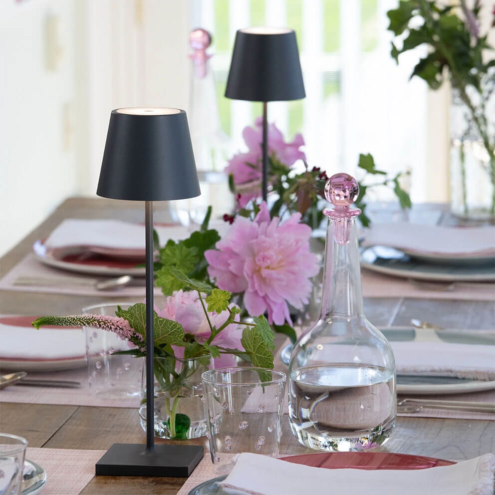 Ta przenośna lampa stołowa Poldina ma stylowy design z klasycznym kloszem na smukłej nodze z dyskretną podstawą. Lampa dostępna jest również w mniejszych wersjach mini i micro.