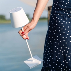 Ta przenośna lampa stołowa Poldina ma stylowy design z klasycznym kloszem na smukłej nodze z dyskretną podstawą. Lampa dostępna jest również w mniejszych wersjach mini i micro.